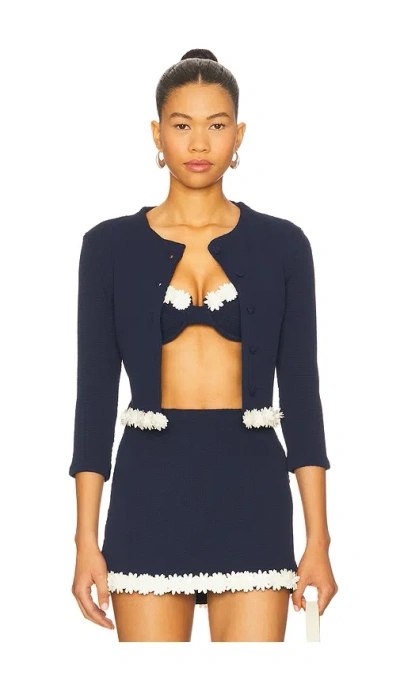 DEVON WINDSOR Harlan Jacket in Navy. Size L, S, XL, XS. Self: 96% nylon 4% elastane Trim: 100% nylon ribbon Contrast Fabric 1: 100% polyester petals Contrast Fabric 2: 100% glass beads. Hand wash. Front button closure. Midweight textured knit with hand-beaded floral applique. DVWS-WO26. SU25515JK. DEVON WINDSOR launched with a collection of fashion forward swimwear in 2019. Made of luxurious Italian and Brazilian fabrics, the line incorporates refined details and unique hardware on styles including high cut bikinis, belted and cut out full-piece suits. Since its debut, the collection has expanded to offer an array of stylish resort wear and cover ups for both on and off the beach. Easy, wearable styles including cropped jackets, mini skirts, and knit dresses make for confident looks with minimal effort.