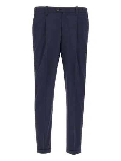 These navy blue stretch viscose blend trousers offer exceptional comfort both in feel and wear. Featuring front darts, an elasticized waist with belt loops, and practical side welt pockets alongside single welt back pockets, they are designed for ease. The trousers fasten with a zip and button, have a straight leg with a 17cm hem and a 2.5cm turn-up, and are crafted in Italy for a tapered fit..