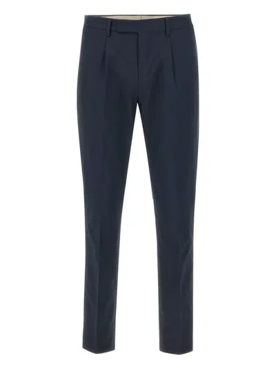 Men's trousers in blue, crafted from a stretch cotton blend with a luxurious feel. They feature a button and zip fly, single dart, straight leg with a 17cm hem, belt loops, French pockets, and back pockets with snap buttons. Slim fit and made in Italy.