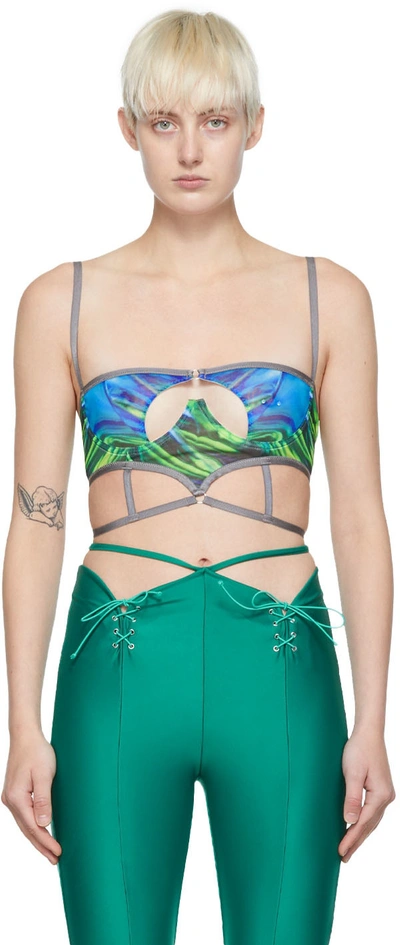 Polyester mesh bra. Graphic pattern printed throughout. · Square neck · Adjustable shoulder straps · Cut-out at front · Adjustable hook-eye fastening at back · Adjustable press-release strap at hem Supplier color: Green
