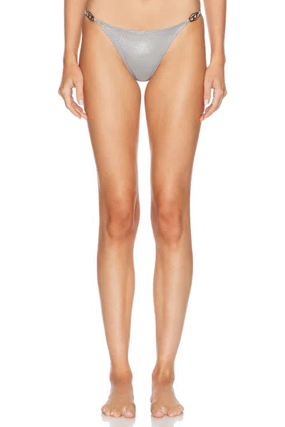 Diesel Brief Bikini Bottom in Silver - Metallic Silver. Size XS (also in L, M, S). Self: 78% nylon 22% elastane Lining: 85% nylon 15% elastane. Made in Tunisia. Hand wash. Pull-on styling. Logo hardware accent at hip. Item not sold as a set. DIEF-WX15. A15483-0WHAU. About the designer: