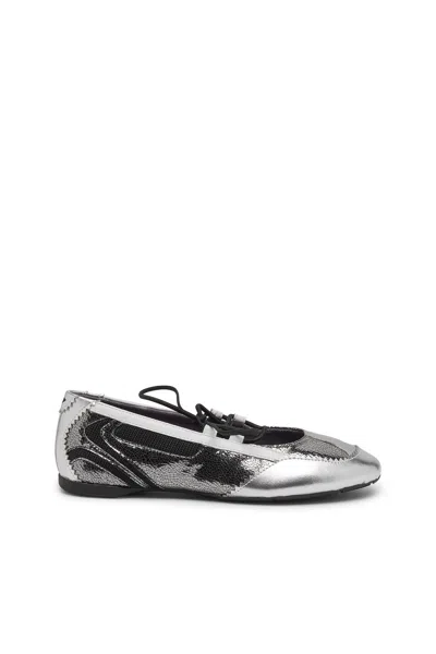 DIESEL D-mile-metallic Lace-up Ballet Flats In Silver