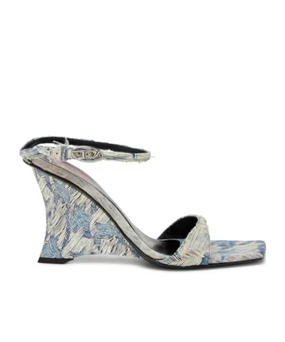 Diesel introduces these stylish wedge heel sandals, designed with a unique ankle strap and a fashionable buckle closure. Made from premium jacquard fabric, they display a beautiful pattern in blue and cream, complemented by a sophisticated square toe and a discreet logo on the insole, ideal for elevating any outfit. - Wedge heel design - Ankle strap with buckle closure - Crafted from jacquard fabric - Blue and cream pattern - Square toe - Subtle logo detail on insole