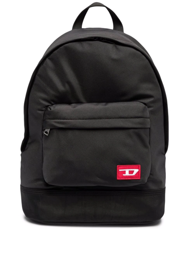 Black fabric logo patch zip-up backpack from DIESEL featuring logo patch to the front, top zip fastening, two adjustable shoulder straps, single top handle, main compartment and front zip-fastening compartment.