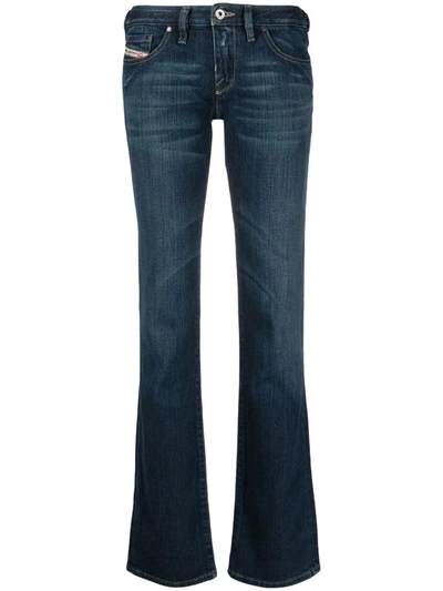 1969 D-Ebbey 09b90 bootcut jeans from DIESEL featuring indigo blue, stretch-cotton, front button and zip fastening, belt loops, two rounded pockets to the sides, flared, logo patch to the rear and two rear patch pockets. Conscious: This item contains cotton from a brand that is committed to improving farming practices globally through the Better Cotton Initiative (BCI)..