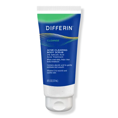 DIFFERIN ACNE-CLEARING BODY SCRUB. Benefits: Deep cleans to eliminate breakouts all over the body. A unique combination of 2% salicylic acid and 1% glycolic acid breaks up clogged pores and reduces the appearance of acne marks and discoloration. Gentle, water soluble Vitamin E exfoliating beads buff away pore-clogging gunk and grime. Soothes and treats skin without overdrying/damaging. Oil-free, non-comedogenic, paraben-free, dermatologist-tested. Key Ingredients: Salicylic Acid 2%: Treats acne by unclogging blocked skin pores. Glycolic Acid 1%: A super-exfoliator, reduces the appearance of marks and dark spots left behind by acne. Vitamin E Beads Water soluble, improves the appearance of hyperpigmentation and scars. :