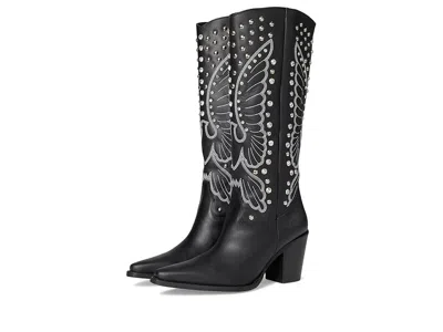 Dingo Diamonds Forever - Women's Boots : Black : Where edge meets elegance, the Dingo Diamonds Forever boot turns every stride into a statement. Crafted with a premium leather upper and soft polyester lining, it promises lasting comfort and unmatched flair. The foam insole cushions every step, while the durable rubber outsole keeps you grounded through all adventures. Designed with a sleek snip toe, sturdy block heel, and effortless pull-on style, this knee-high beauty combines rugged charm with runway sparkle. Bold stitching and glimmering rhinestones add that fearless shimmer. ; Imported. Measurements: ; Heel Height: 2 3 4 in ; Weight: 1 lb ; Circumference: 14 in ; Product measurements were taken using size 9, width B - Medium. Please note that measurements may vary by size. | Dingo Diamonds Forever Women's Boots Black : 7 B - Medium, Leather