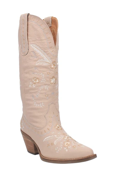 Artful floral embroidery puts an enchanting spin on a knee-high Western boot shaped from rich leather and grounded by a cushioned insole.