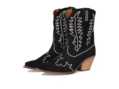 Dingo Tiny Pony - Women's Boots : Black : The Dingo Tiny Pony is where Western dreams meet runway glam! Giddy up and sparkle on in these show-stopping boots that blend country charm with city edge. The suede upper dazzles under the light with all-over rhinestone detailing, while the iconic cowboy stitching keeps that heritage flair alive. A snip toe and block heel bring sleek sophistication, and the pull-on design makes getting ready a breeze. With a soft polyester lining, foam insole for cushioned comfort, and a durable rubber outsole, you can strut, dance, or ride in effortless style. The mid-calf silhouette hits the sweet spot between bold and wearable. ; Imported. Measurements: ; Heel Height: 2 3 4 in ; Weight: 1 lb ; Circumference: 10 in ; Product measurements were taken using size 9, width B - Medium. Please note that measurements may vary by size. | Dingo Tiny Pony Women's Boots Black : 6.5 B - Medium, Suede