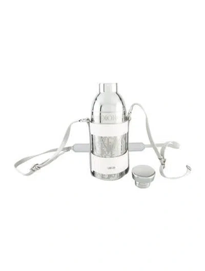 Grey, white and silvertone stainless steel Christian Dior Aqua water bottle with shoulder strap featuring screw off cap, adjustable length straps, logo print at sides and raised brand stamp at lower strap face. Includes dust bag. | Christian Dior Aqua Bottle with Strap in Silver/White