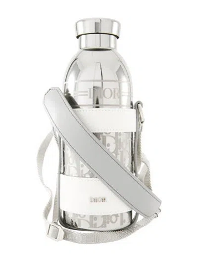 Grey, white and silvertone stainless steel Christian Dior Aqua water bottle with shoulder strap featuring screw off cap, adjustable length straps, logo print at sides and raised brand stamp at lower strap face. Includes dust bag. | Christian Dior Aqua Bottle with Strap in Silver