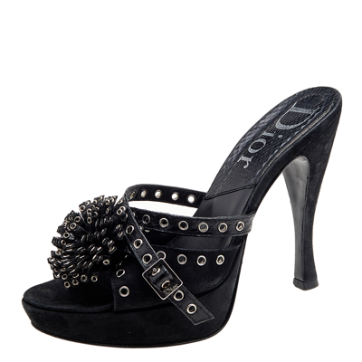 Exude poise and perfection as you walk in these slide sandals from the House of Dior. They are crafted using black perforated suede and python skin on the exterior. They flaunt eyelet embellishments and 12 cm heels. Make a stunning style statement as you wear these sandals