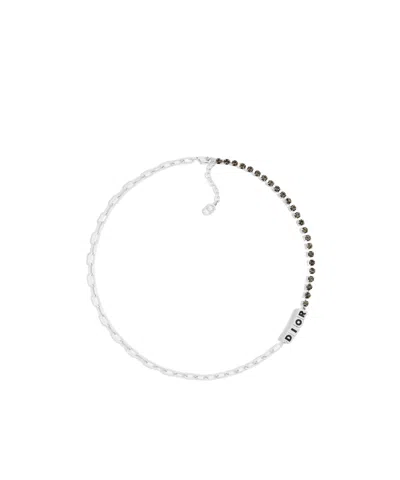 New for Fall 2025, the Dior Cube necklace is a modern creation. The asymmetrical design combines silver-finish brass links with gray crystals, displaying cubes adorned with the Dior signature in black lacquer. An adjustable clasp enhanced by an openwork CD Icon signature allows it to be worn in a variety of lengths. The necklace can be coordinated with other Dior Cube creations to complete the look.