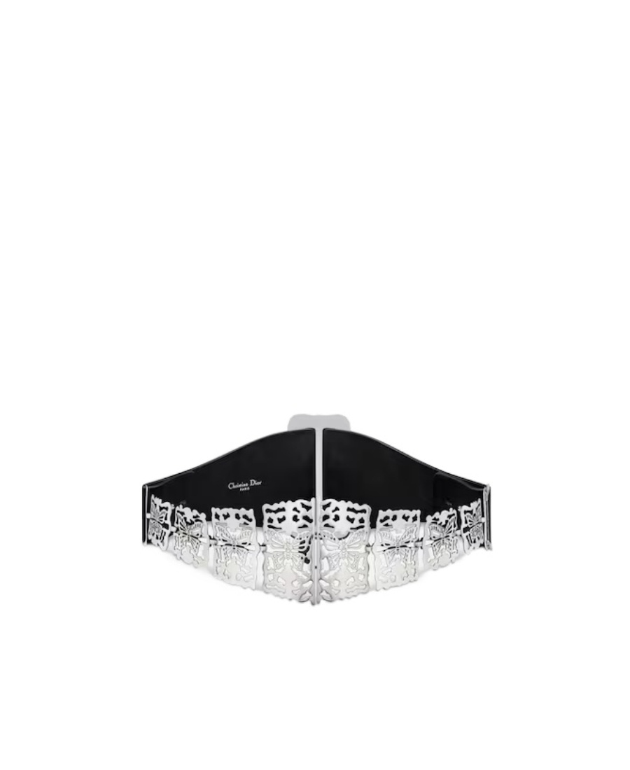 CD signature on the front, Christian Dior Paris signature on the interior, side slide adjustment, antique silver metal.