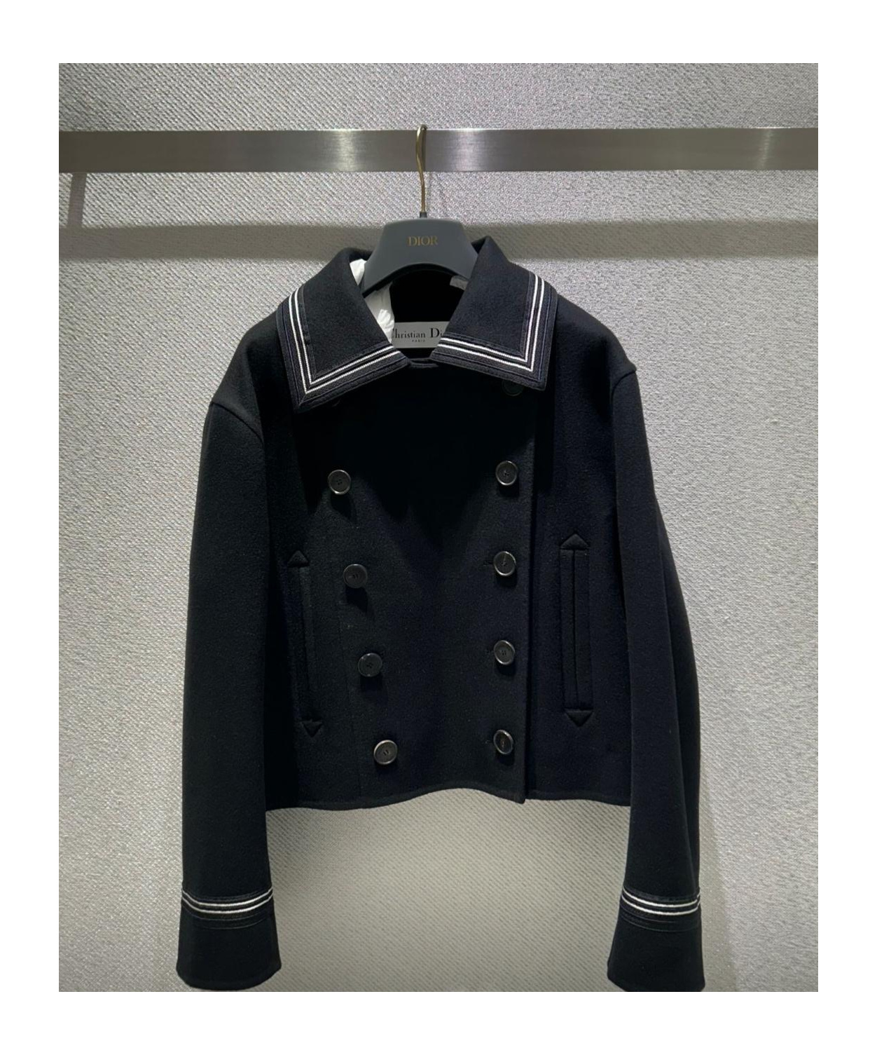 The double-breasted peacoat redefines House codes of elegance. Crafted in black double-sided virgin wool- and angora-blend felt, the regular-fit silhouette is enhanced by white passementerie. Completed by slit pockets, the sophisticated peacoat will elevate any attire with a refined touch.