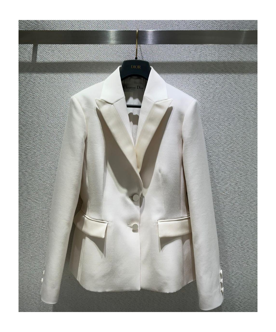 Unveiled at the Cruise 2026 Fashion Show, the jacket redefines House codes of elegance and refinement. Crafted in white wool and silk shantung, it features a silk satin-covered button closure, a notched lapel collar and flap pockets highlighting the waist. True to the spirit of the show, the jacket can be paired with a diaphanous skirt for a quintessential Dior look.
