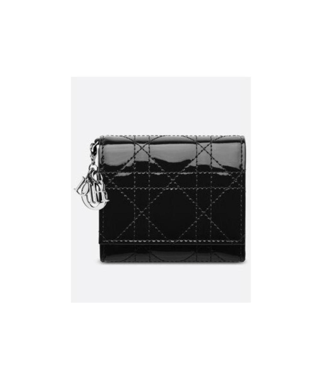The Lady Dior Lotus wallet is offered in a most elegant version Crafted in black patent calfskin it honors Dior s codes with its timeless Cannage topstitching and D I O R charm Featuring several separate compartments that can hold both bills and coins this small companion may easily be slipped into any bag or clutch Black patent calfskin with Cannage topstitching D I O R charm 4 card slots 2 patch pockets 1 bill compartment 1 snap-closure pocket Dimensions 10 cm x 8 5 cm Made in Italy