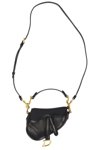dior Dior Mini Saddle Bag in Black - Black. Size all. Black calfskin leather exterior with suede lining and gold-tone hardware. Made in Italy. Foldover flap closure. One main compartment. 1 exterior flat pocket. Removable strap included. Measures approx 5 W x 4.5 H x 2 D Top handle with a 3 drop. Good. Light scratching to exterior hardware. Original brand box, dustbag, authenticity card, and hang tag not included. FNEF-WY6074. 11211546. About the designer: