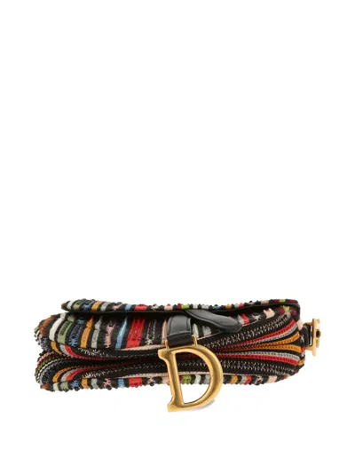 black/multicolour canvas leather trim signature CD logo logo charm saddle-shape body single top handle foldover top main compartment internal logo patch gold-tone hardware Condition: GOOD. This previously owned and used item is in good condition with minimal signs of use. This may include fading of material or plating and scratches.