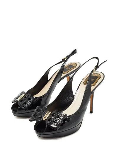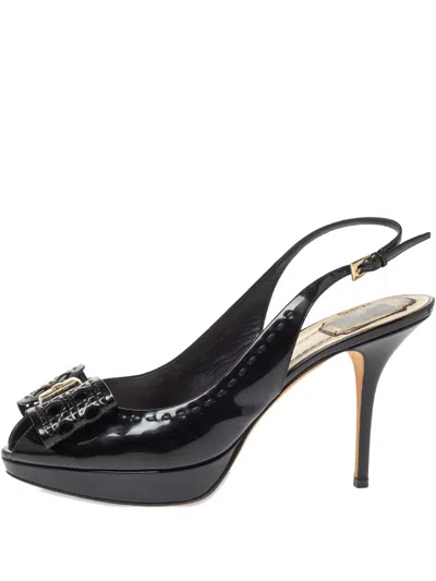 black patent leather cannage patterned butterfly bow motifs buckled slingback strap platform heel high stiletto heel Condition: GOOD. This previously owned and used item is in good condition with minimal signs of use. This may include fading of material or plating and scratches.