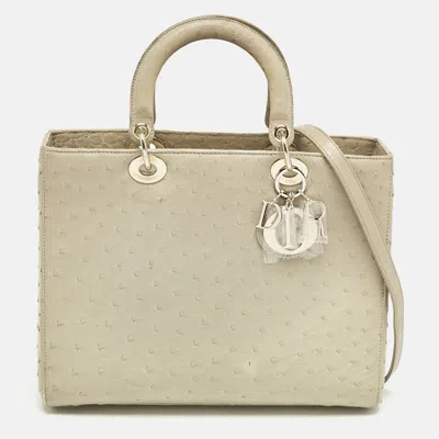 Exquisite in every stitch this large Lady Dior tote is crafted from light beige ostrich leather. Metal feet rounded top handles and gleaming charms finish this piece with timeless charm.