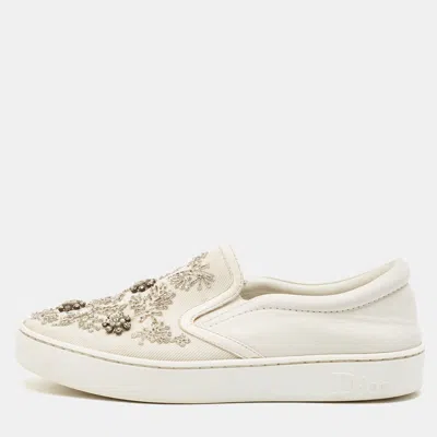Pre-owned White Denim And Leather Happy Crystal Embellished Slip On Sneakers Size 37