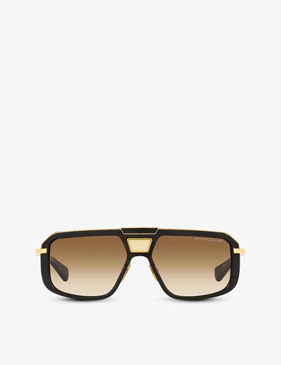 Dita acetate and titanium sunglassesFrame 100% acetate; Brow bar and grille 100% titanium; Bridge plate 100% enamelStyle number: DTS400-A-01-ZRectangular frame, gold-tone hardware, gradient lenses, curved shield lens, centre cut-out with titanium mesh inlay, two-piece brow inlay, enamel detailing at bridge, forked hinge mechanism, UVA and UVB lenses, anti-reflective coatingDimensions: Lens width 131mm, frame height 51mm, temple length 130mmWipe with a clean, dry clothMade in Japan