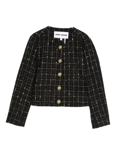 black check pattern front button fastening round neck long sleeves gold-tone buttons