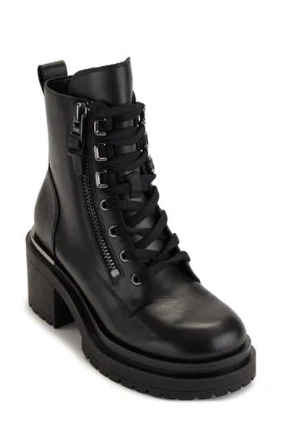 Give any outfit a boost with this contemporary combat boot featuring a gleaming metallic-inset block heel and a chunky lugged platform sole. 3" heel; 1" platform; 2" slope Lace-up style; side zip closure Leather upper/synthetic lining and sole Imported