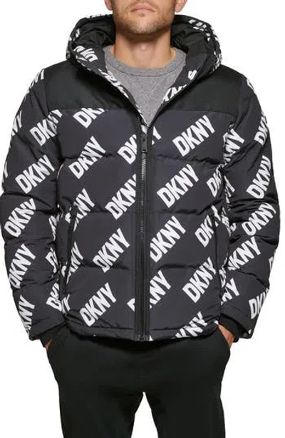 Covered in an allover logo print, this puffer jacket has an attached hood and is tailored in a classic fit. Attached hood Long sleeves Zip front Two waist zip pockets One inside zip pocket Lined Polyester Fill: Polyester Machine wash Imported SIZE & FIT Classic fit About 27.5" from shoulder to hem. Men's - M Outerwear > Saks Off 5th. DKNY. Color: Black White. Size: S.