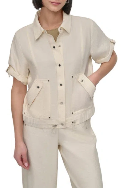 Rolled-and-belted sleeves frame this textured lightweight jacket made with a drawcord hem to shape the silhouette. Front snap closure Spread collar Elbow-length sleeves Front button-flap pockets 87% rayon, 12% nylon Machine wash, dry flat Imported