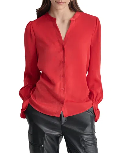 Introducing the 'DKNY Split Neck Top' for women, a stylish addition to your wardrobe. This red light top features a split neckline and elastic flare cuffs for a chic look. With a button front closure, this top is made from 100% polyester and is machine washable for easy care. Approximating 25 inches from shoulder to hem, this imported top is perfect for adding a pop of color to your outfit. Elevate your style with this trendy and versatile top from DKNY.