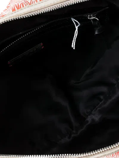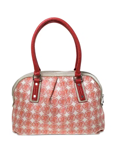 red/white coated canvas logo pattern dual top handles Condition: GOOD. This previously owned and used item is in good condition with minimal signs of use. This may include fading of material or plating and scratches.