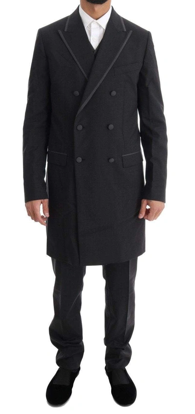 Step into the world of high fashion with this stunning Dolce & Gabbana suit. Exemplifying Italian craftsmanship, this black suit with subtle gray detailing is tailored for a modern fit that guarantees a sharp silhouette. A double-breasted blazer, stylish vest, and sleek trousers compose this elegant three-piece set. The blazer features a two-button closure, two inside pockets, and a single vent in the back for a classic touch, while the vest boasts full button closure and an adjustable back strap for the perfect fit. Completing the ensemble, the trousers offer a comfortable 3-way zipper closure. This rare runway collection piece is more than just a suit; it’s a statement of sophistication and exclusivity.. Color: Black. Style: Double breasted 3 piece suit. Closure: Two button closure. Fitting: Modern Fit. Material: 97% Wool, 3% Elastane. Lining: 36% Rayon, 34% Acetate, 30% Cupro. Country of origin: Italy. .