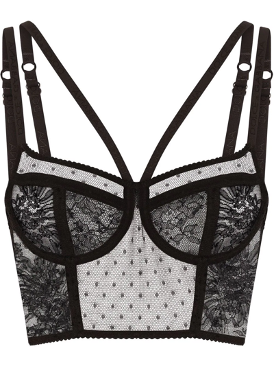 Black point d'esprit tulle corset from DOLCE & GABBANA featuring point d'esprit tulle, scallop edge, adjustable shoulder straps, underwire cup and concealed rear fastening. Be sure before opening, as socks and hosiery can only be returned in their original, unopened packaging..