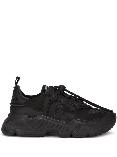 Black leather Daymaster low-top sneakers from DOLCE & GABBANA featuring round toe, front lace-up fastening, branded heel counter, logo patch at the tongue, pull-tab at the heel, chunky rubber sole and logo patch to the side.
