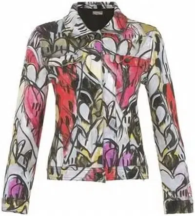 A casual yet cool jacket that every closset needs.Gorgeously unique jacket featuring soft Cotton fabric with stretch for extra comfort and a lovely painting by artist Lori Arbel from Florida entitled 'Watermelon Heart'!Collar necklineButtoned front closureWearable art jean jacketSplit button cuffsPocketsLightweightRhinestone designArt front to backSophisticated and sleekHits about hiplineHot Hues - Pink, Red, Black, PlatinumMachine or hand wash cold, inside out. Delicate cycleMade in Turkey (Designed in Canada)