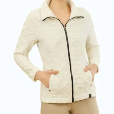 Fit to perfection and effortlessly chic.Elevate your wardrobe with the Dolcezza Knit Pullover Top, a chic off-white piece designed for both style and comfort. Featuring long sleeves and a textured geometric pattern, this top is crafted from 95% Polyester and 5% Elastane, offering a modern, flattering fit. Designed with a stand-up collar and zip closure, it provides a timeless silhouette, complemented by two front pockets and the brand's logo on the hem. The jacket's total length is approximately 25 inches, making it perfect for pairing with jeans or trousers.