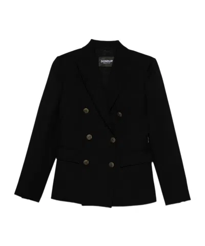 The Nero jacket by Dondup embodies sophistication and versatility. Made from 100% virgin wool, this tailored double-breasted piece features sharp lapels and six metallic buttons, creating a refined silhouette. Long sleeves include button details at the cuffs while two front flap pockets add functionality. This jacket is perfect for layering, effortlessly transitioning from casual to formal settings. Composition - 100% virgin wool Color - Black Style - Tailored, Double-breasted Gender - Women