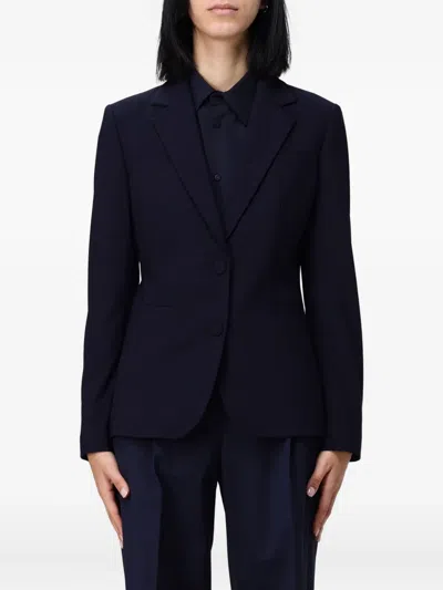 dark blue button detail at cuff notched lapel single-breasted button fastening welt pocket