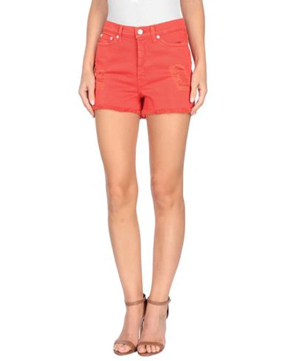 DONDUP Denim shorts. denim, worn effect, logo, metal applications, solid color, colored wash, mid rise, front closure, button closing, multipockets, stretch, fringed hem. 98% Cotton, 2% Elastane