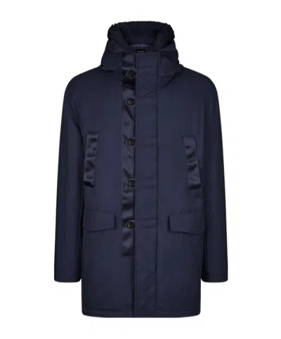 Concealed zip closure with exposed buttons on the grosgrain ribbon, grosgrain appliqués on the upper welt pockets, and pointed flaps on the lower pockets.
