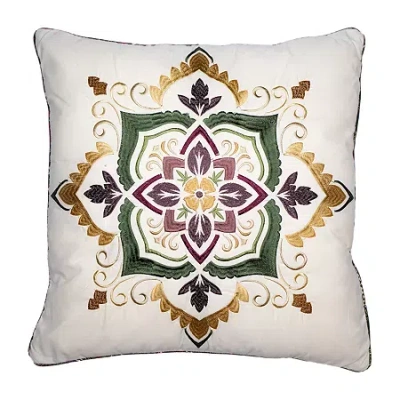 This lovely decorative pillow features a series of vibrant, embroidered damask designs that are arranged from rich olive, forest green, warm gold, burgundy and ivory with pops of cinnamon colors on an ivory backdrop. A zip closure helps for easy removal and cleaning. Spot clean only. Coordinates with donna sharp's spice postage stamp UCC bedding collection. 100% polyester cover; 100% rayon decoration. Dimensions 18" x 18".Features: Removable CoverShape: SquarePillow Size: 18 X 18 InBack Fabric: MicrofiberFront Fabric: DamaskFiber Content: 100% PolyesterFilling Content: 100% PolyesterCare: Spot CleanDecor Styles: Traditional, FarmhouseMaterial: PolyesterCountry of Origin: Imported