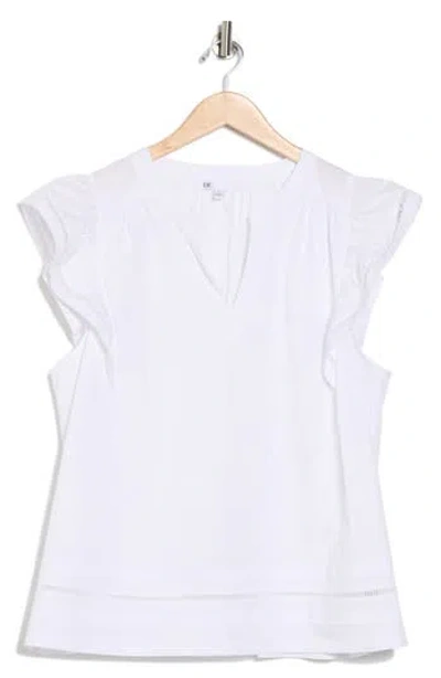 Ladder-stitch embroidery trims the fluttery sleeves of this lightweight top made of stretchy cotton-blend poplin. Split neck Cap sleeves 68% cotton, 26% nylon, 6% spandex Machine wash, tumble dry Imported