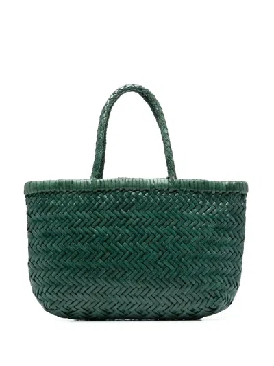 Mini Flat Gora tote bag from DRAGON DIFFUSION featuring forest green, calf leather, interwoven design, coin detailing, internal logo plaque, two rolled top handles and main compartment.