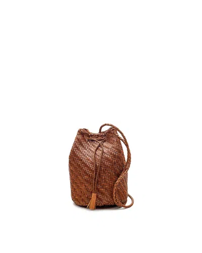 Pompom Double Jump Shoulder bag in brown leather, leather strap, coulisse closure, tassels, logo tag, woven leather, 100% leather, Made in India, Height 180 mm, Width 150 mm
