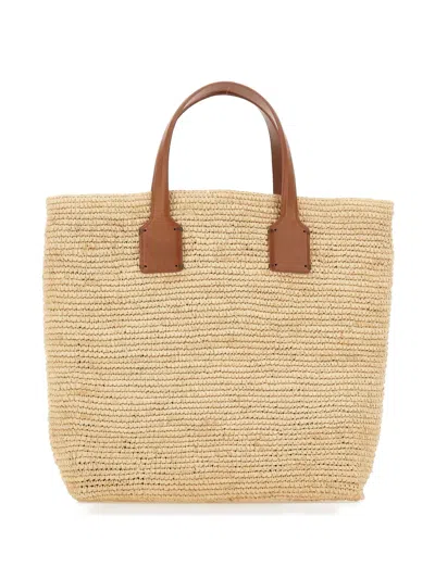 beige handwoven raffia leather inserts two leather top handles adjustable detachable shoulder strap internal patch pocket leather logo patch