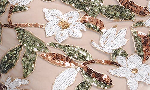 Beautiful blooms made of light-reflecting sequins bring glamour to this long-sleeve gown made with a flared hem that moves with you. 60 1/2" length (size Small) Hidden back zip; keyhole with button-and-loop closure Jewel neck Long sleeves Partially lined Hand wash, dry flat Imported