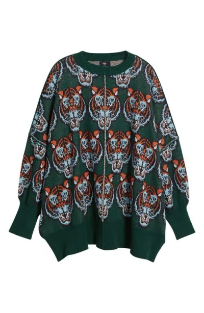 Intarsia-stitched tigers make a fierce statement on this oversized sweater that's ready to stand out from the crowd. Crewneck Long sleeves 60% cotton, 40% acrylic Hand wash, dry flat Imported