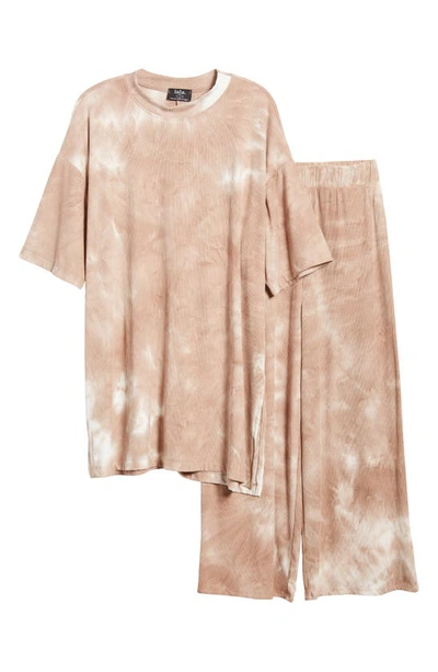 Feel all eyes turn to you in this ribbed set featuring a short-sleeve top and matching wide-leg pants with a subtle tie-dye coloration.